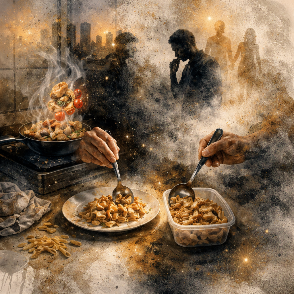 V jednoduchosti je síla. Primitivní recept na jednoduché těstoviny. Zapěním cibulku, přidám kuřecí maso a rajčata. Nakonec smíchám s těstovinami. Hotové jídlo dělím - jedna naběračka na talíř, druhá do krabičky. V tom přichází rozpor, který znám z domova. Vždycky, když vařím doma, snažím se více masa dát manželce. Chci ji dopřát a vždy mám pocit, že mám mít méně, abych ji neošidil a pak jí to nebylo líto.