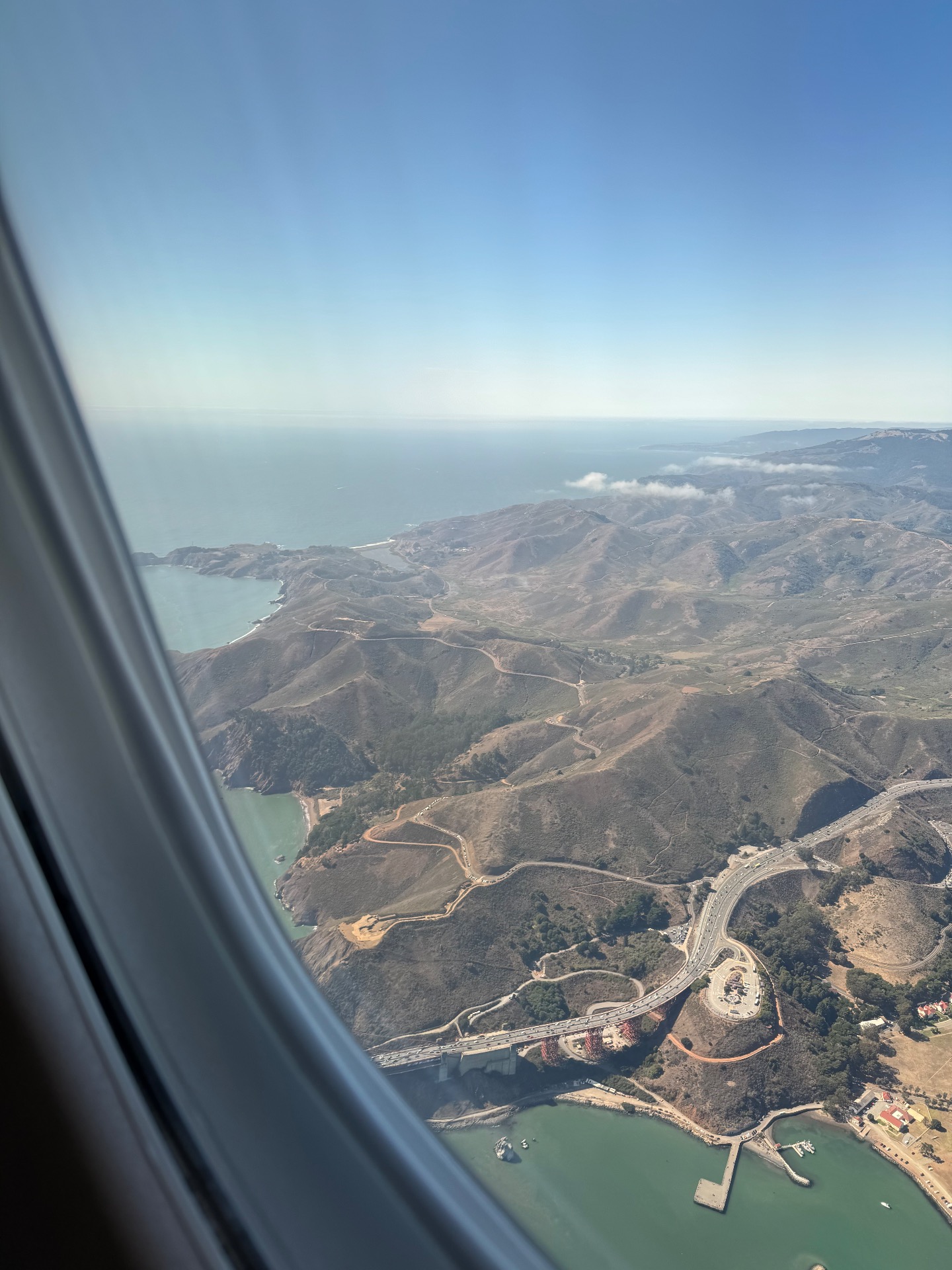 Let do LA vede nad Golden Gate bridge. Akorát letíme přesně nad ním, takže ani z jedné strany není vidět. Co se mi líbí na mimo evropských aerolinkách, je business class i v malých letadlech. Z toho by se evropské aerolinky měly ponaučit. Toto vídám i v Africe.