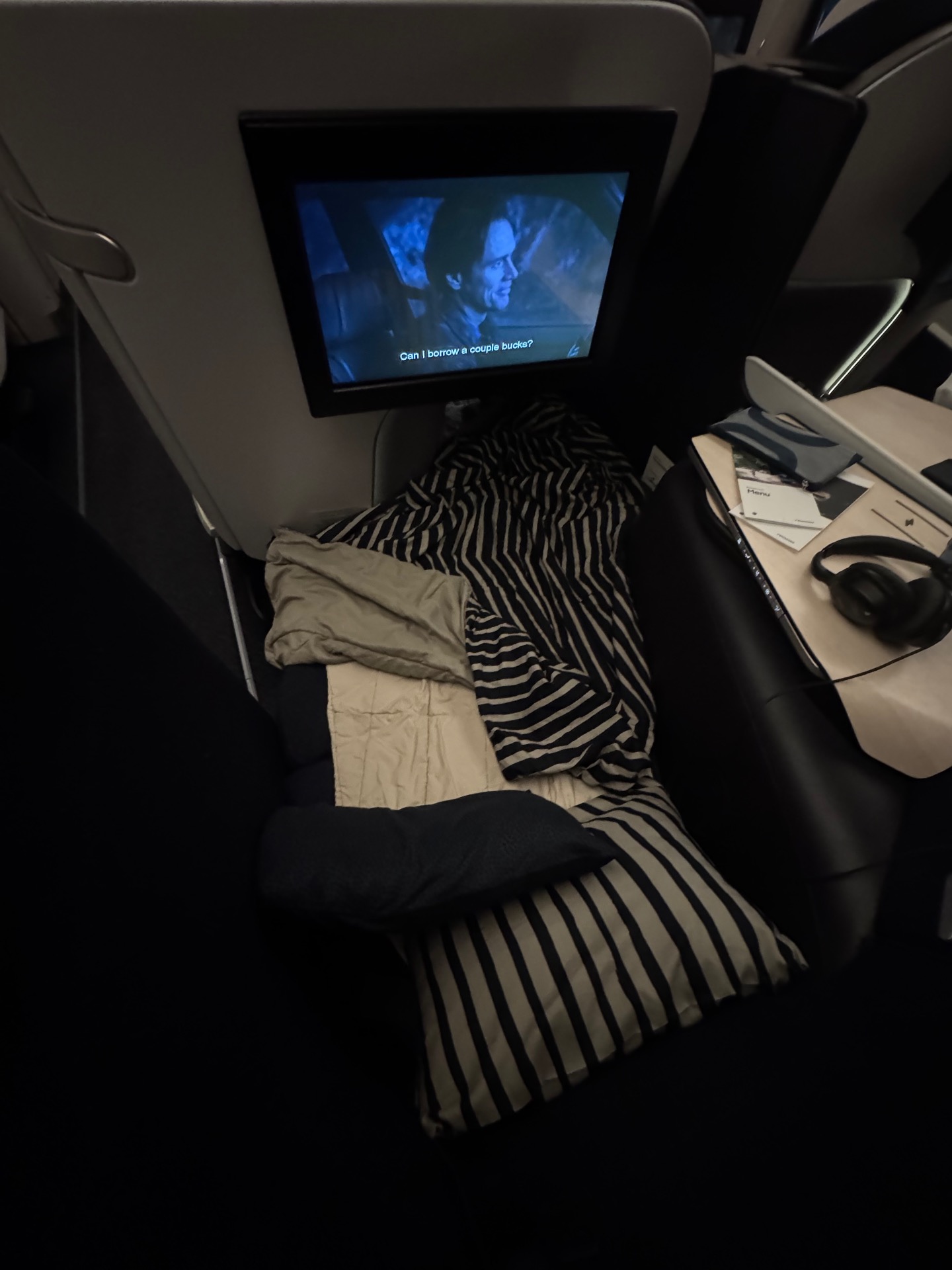 Servis, posádka a jídlo jsou absolutně v topu. Sedadlo si po večeři ustelu, poprvé si dávám "prostěradlo" v letadle. Co se týče pohodlí ke spánku, hodnotím velmi kladně. Sedadlo je poměrně široké, cítím v něm soukromí, prostě co víc si přát. Líbí se mi ta vize Finnairu, že si to udělali po svém.